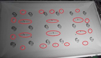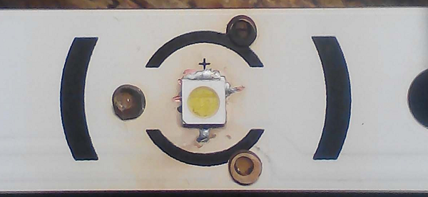 То, что повреждена немного краска — не беда. Точно так же впаиваем остальные светодиоды, а линзы приклеиваем на суперклей. А это отремонтированный вид собранной и готовой к дальнейшей эксплуатации панели подсветки: