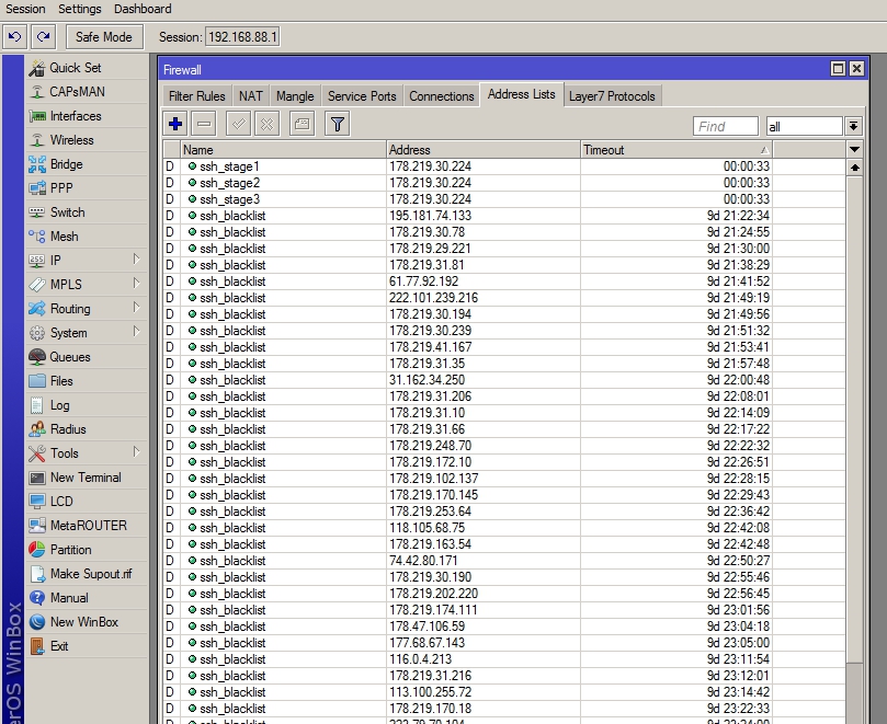 add action=add-src-to-address-list address-list=ssh_blacklist address-list-timeout=1w3d chain=sshbruteforces connection-state=new src-address-list=ssh_stage3